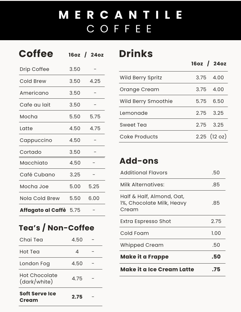 From a reviewer’s perspective, the menu at Mercantile Coffee & Feed offers a well-rounded and thoughtfully curated experience that balances seasonal creativity with everyday comfort. The drink selection immediately stands out, especially with its fall-inspired offerings such as Pumpkin Spice Latte, Pumpkin Cookie Coven, Pumpkin Fluffernutter, Peanut Caramel Apple, and Halloweentown, which bring warmth and personality to the menu. Classic coffee lovers are equally well served with staples like Drip Coffee, Cold Brew, Americano, Cafe Au Lait, and Mocha, ensuring there is something familiar alongside the more adventurous choices. For those who prefer tea or non-coffee options, selections like Chai Tea, Hot Tea, London Fog, and Hot Chocolate add comforting variety. The specialty drinks elevate the menu further, with indulgent options such as Oatmeal Cream Pie Latte, White Chocolate Raspberry Latte, Cinnamon Bun Latte, Smores Latte, and Chocolate Covered Strawberry Latte, each designed to feel like a dessert in a cup. Food-wise, the café keeps things simple but satisfying, highlighted by items like The Harvest Biscuit and Maple Morning Melt, as well as a wide range of breakfast sandwiches including Biscuit Breakfast Sandwich, Bagel Breakfast Sandwich, Croissant Breakfast Sandwich, Toast Breakfast Sandwich, and English Muffin Breakfast Sandwich. Heartier options such as Sausage, Egg & Cheese, Country Ham, Egg & Cheese, Bacon, Egg & Cheese, and Everything But The Espresso cater to bigger appetites, while comforting classics like Signature Grilled Cheese, Bacon & Tomato, and Country Ham & Swiss round out the menu nicely. Seasonal highlights from the winter menu-like Buddy The Elf's Breakfast Latte, Candy Cane Cold Brew, Christmas Cookie Latte, Clark W Griswold Latte, and Eggnog Latte-add a festive touch that keeps the menu feeling fresh year-round. Overall, Mercantile Coffee & Feed’s menu feels cohesive, creative, and approachable, making it a satisfying conclusion to any visit whether you’re stopping in for a quick coffee or a relaxed breakfast.
